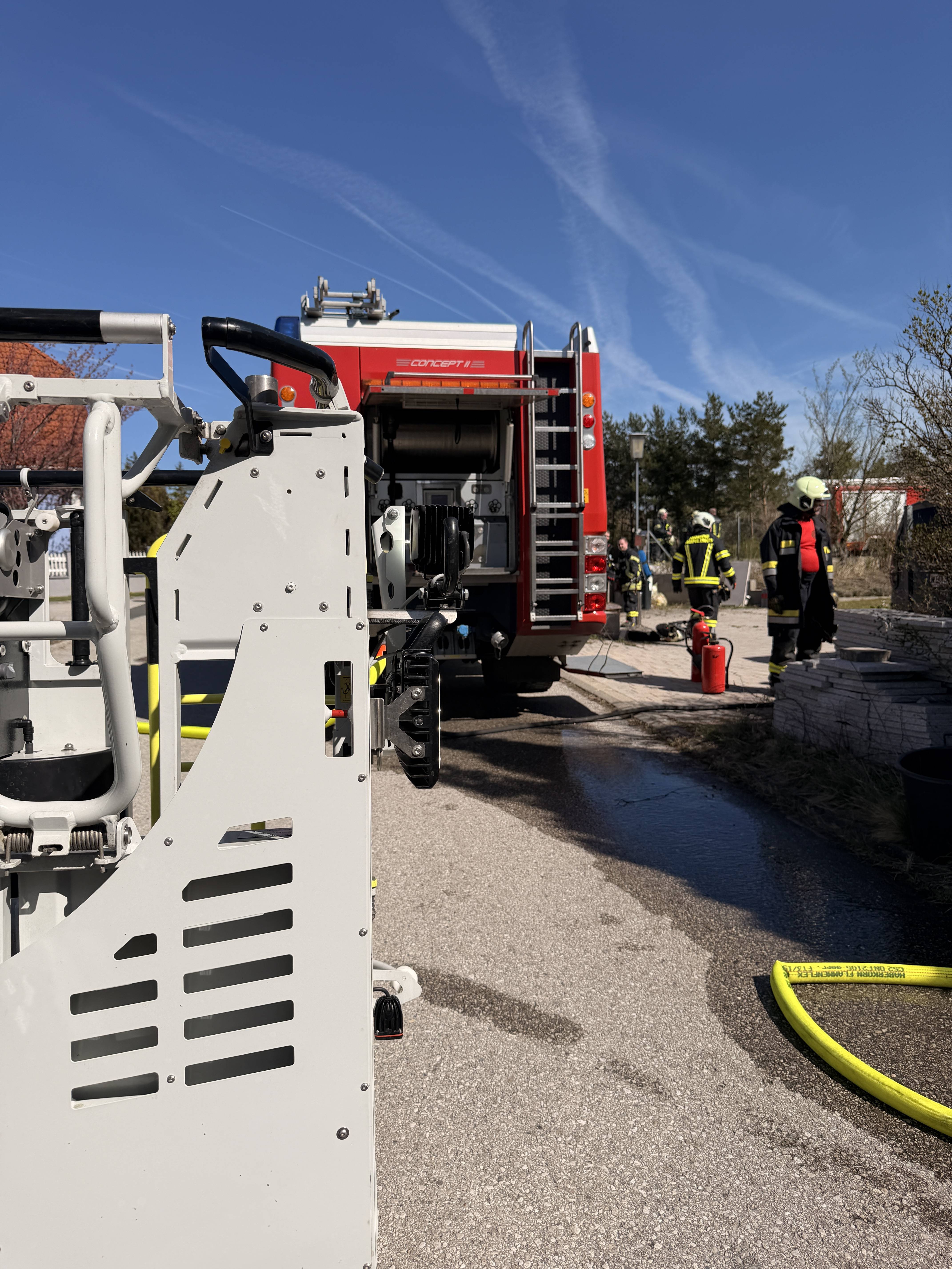 Nach dem Eintreffen am Einsatzort wurde umgehend ein Atemschutztrupp als Sicherungstrupp ausgerüstet. Parallel dazu begann der Aufbau einer Zubringerleitung, um eine ausreichende Wasserversorgung sicherzustellen. Zusätzlich wurde die Drehleiter in Stellung gebracht, um den Dachbereich kontrollieren zu können.