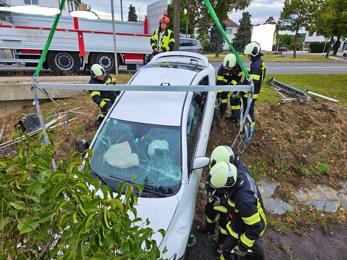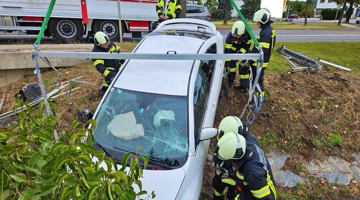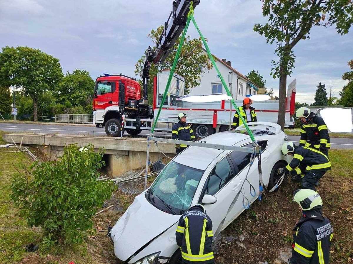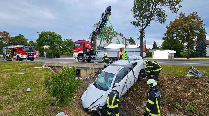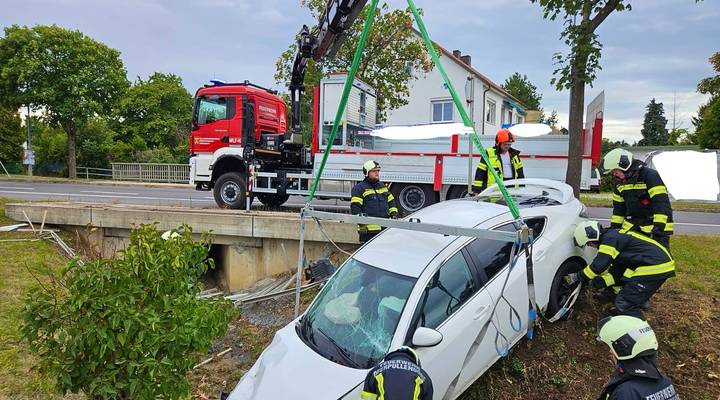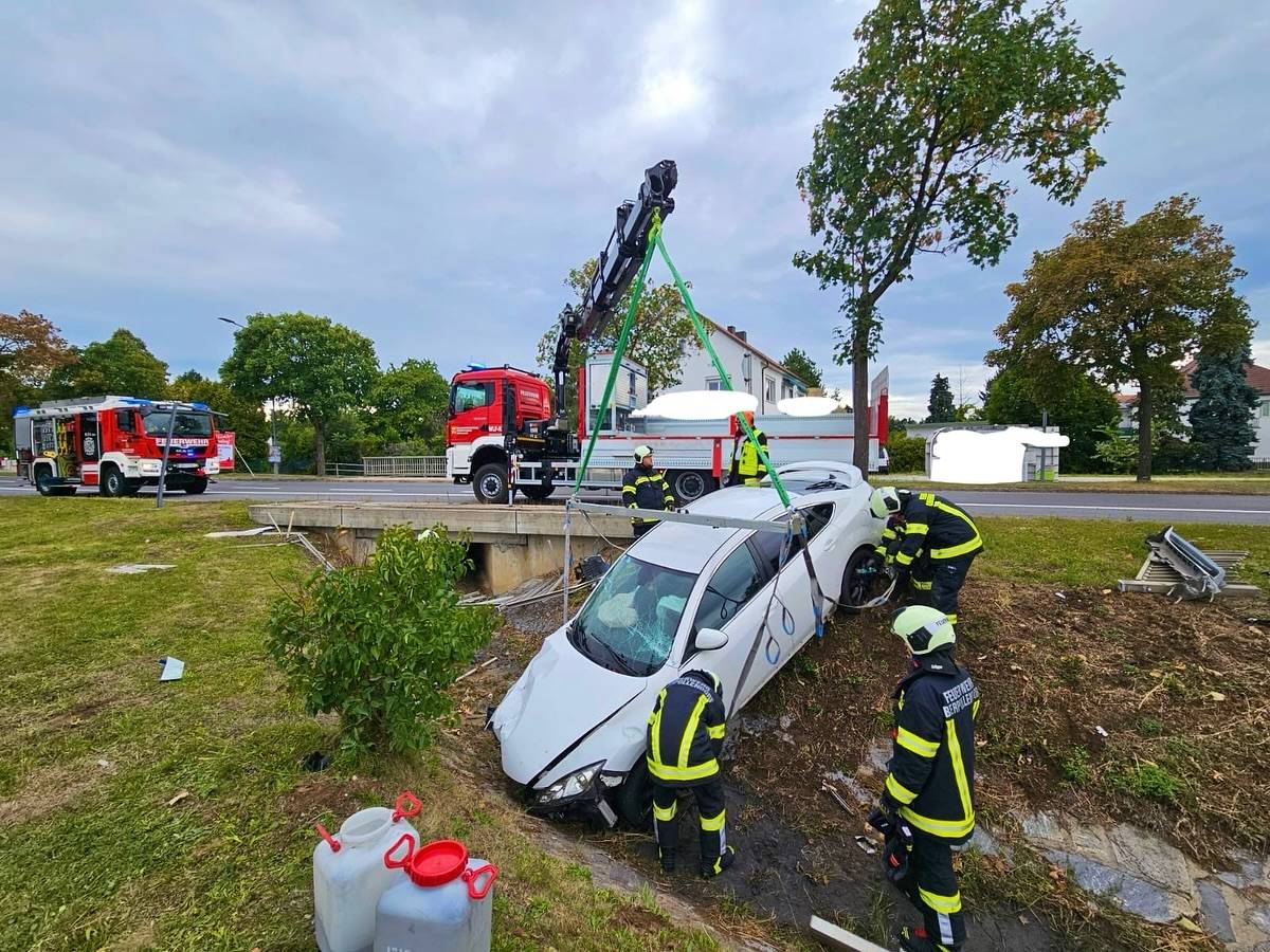 Ein PKW kam aus bisher unerklärlichen Gründen von der Fahrbahn ab, touchierte eine Straßenbrücke und landete im Straßengraben. Dabei kam es zu einem Flüssigkeitsaustritt .