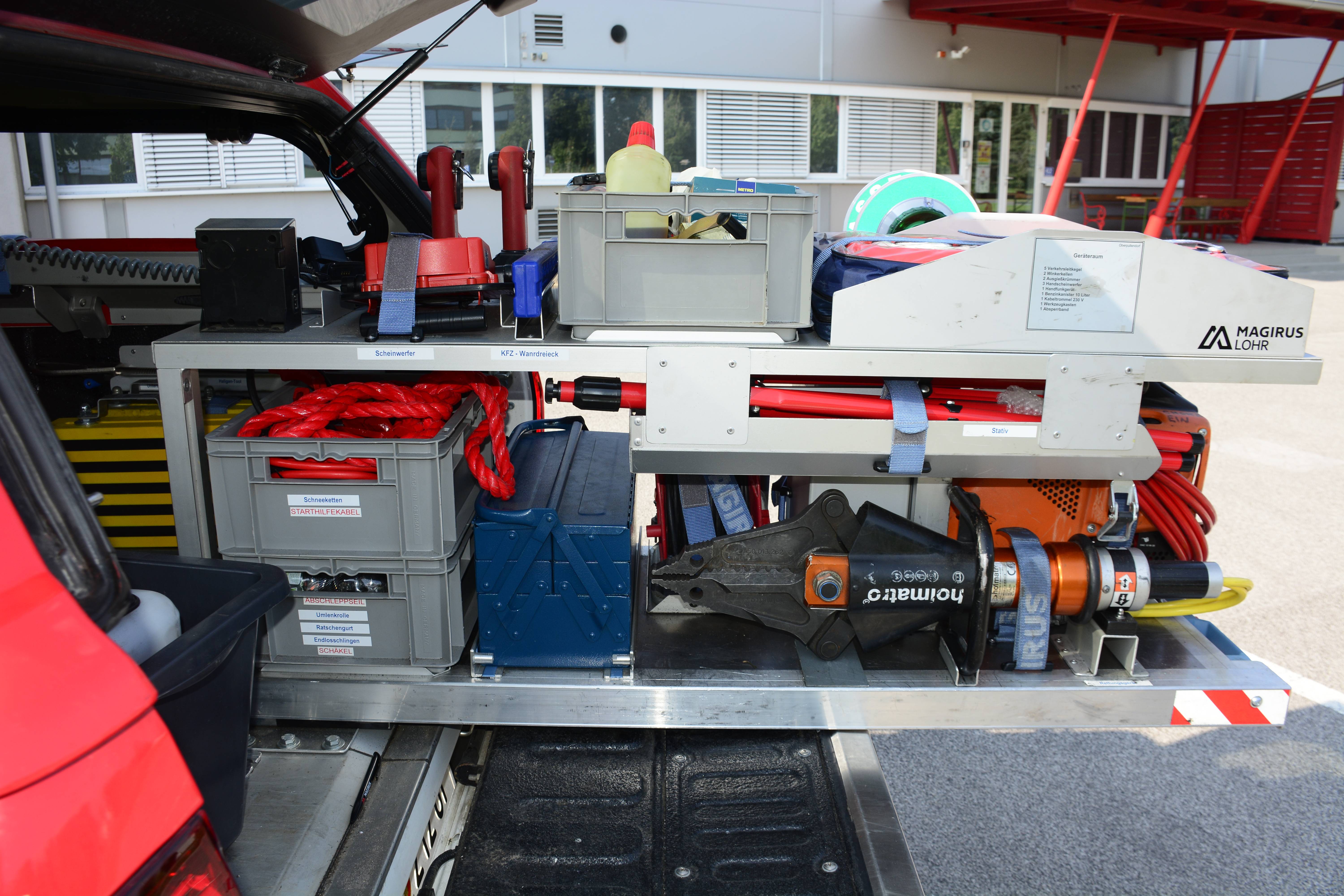 Die Ladefläche beherbergt einen hydraulischen Rettungssatz, welcher für das Retten von Personen aus verunfallten Fahrzeugen verwendet wird, Ölbindemittel und Verkehrsleitkegel.