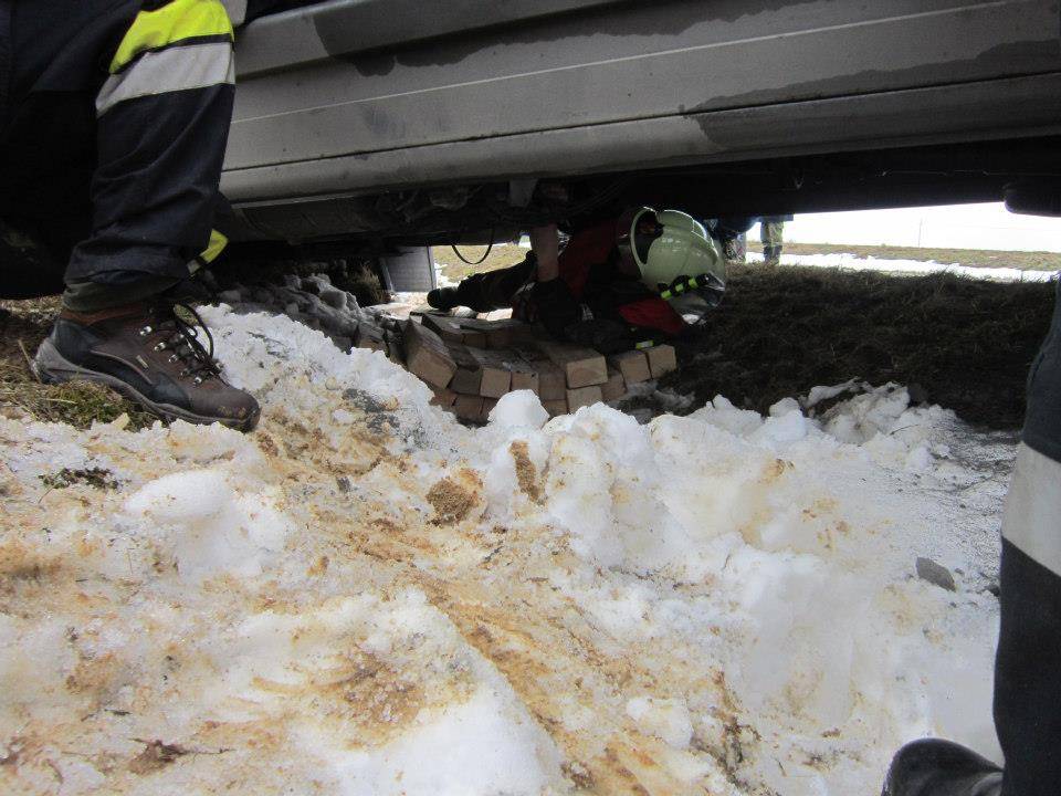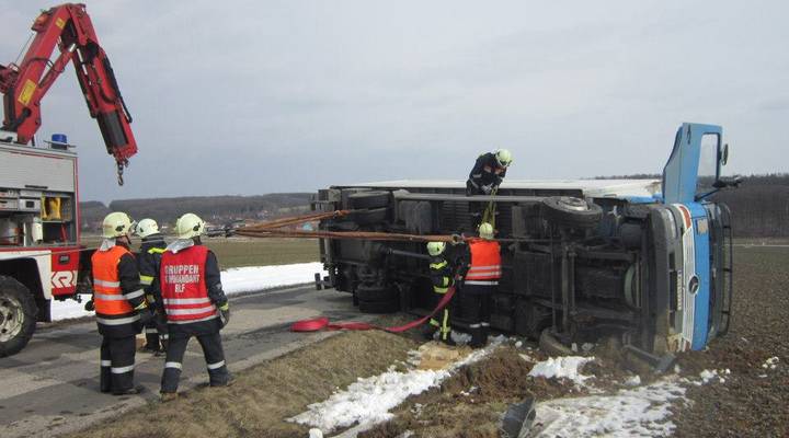 Am 19.02.2013 um 10:39 Uhr wurde ein stiller Alarm für die Stadtfeuerwehr Oberpullendorf ausgelöst. Ein LKW kam auf der Fahrt von Langental nach Oberpullendorf auf einem Güterweg auf eine Schneezunge und dadurch ins Schleudern. Der LKW kam von der Strasse ab und blieb seitlich in einem angrenzenden Feld liegen. Der Fahrer blieb bei dem Unfall unverletzt. Die Stadtfeuerwehr Oberpullendorf machte sich mit SRFA, SOF und VF auf den Weg zum Einsatzort. Bei der Erkundung mußte festgestellt werden, das man die FF Steinberg nachalarmieren muß. Mit Hilfe der Winden von SRFA, RLF Steinberg und Kran des SOF konnte der LKW wieder aufgerichtet werden. Da der Boden stark aufgeweicht war stellte sich die weitere Bergung jedoch schwieriger als angenommen dar. So mußte unter anderem eine Rampe aus Unterleghölzer gebaut werden um den LKW wieder auf die Fahrbahn zurückziehen zu können. Anschließend wurde der LKW in der Nähe des Feuerwehrhauses abgestellt, damit die Güter umgeladen werden konnten. Es waren SRFA, SOF, VF und 7 Mann, sowie die FF Steinberg mit RLF und MTF im Einsatz.