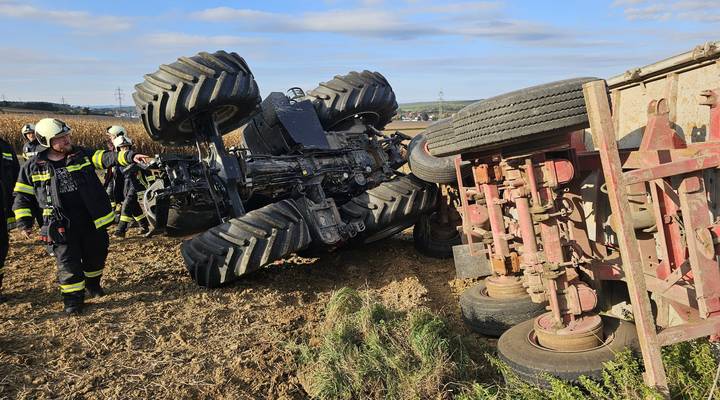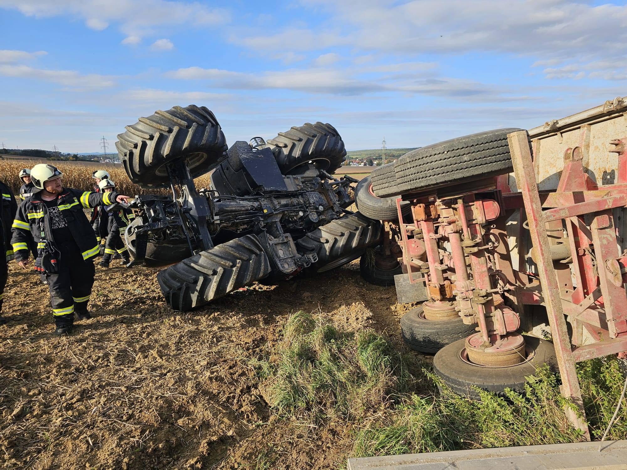 Am Sonntagnachmittag wurde unsere Feuerwehr zu einem technischen Einsatz auf einem Acker in Mitterpullendorf alarmiert. Ein Landwirt hatte uns telefonisch darüber informiert, dass sein Traktor samt beladenem Dreiachsanhänger verunglückt war und seitlich zum Liegen gekommen ist.