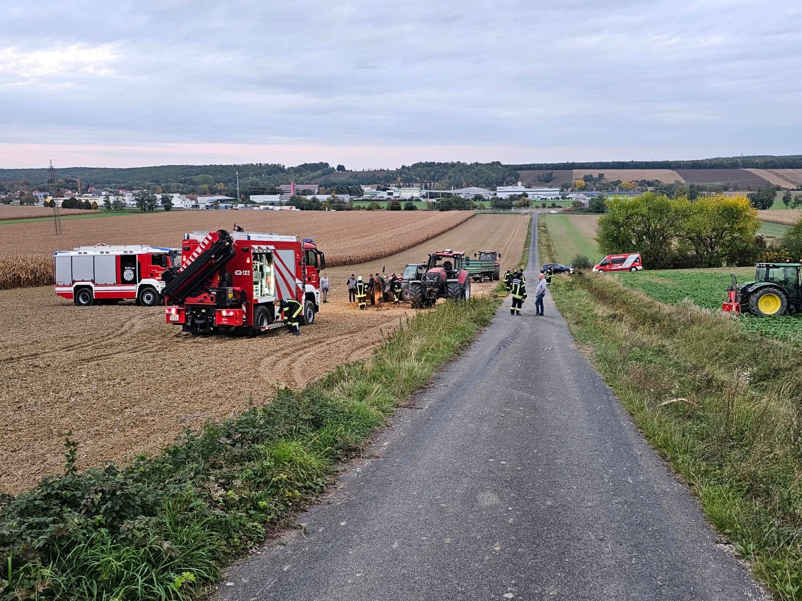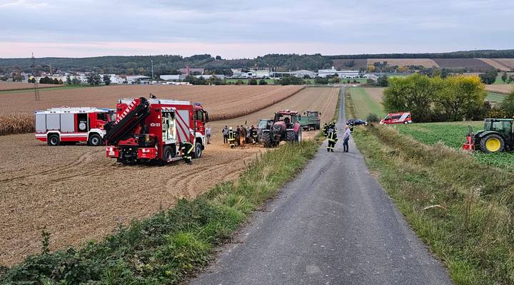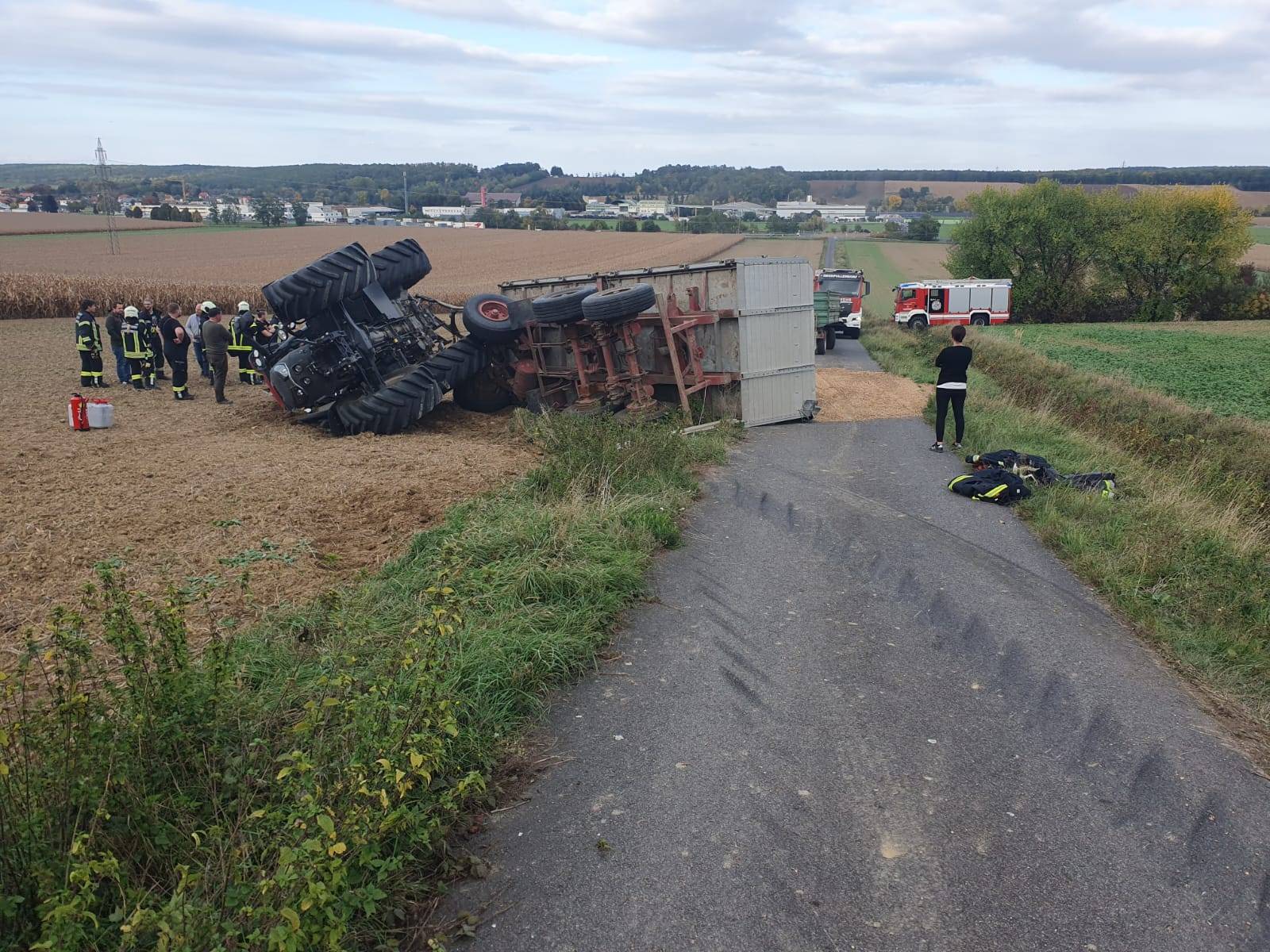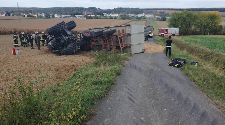 Vor Ort zeigte sich, dass der Anhänger mit Sojabohnen teilweise umgestürzt war und die Ladung bereits ausgetreten ist.